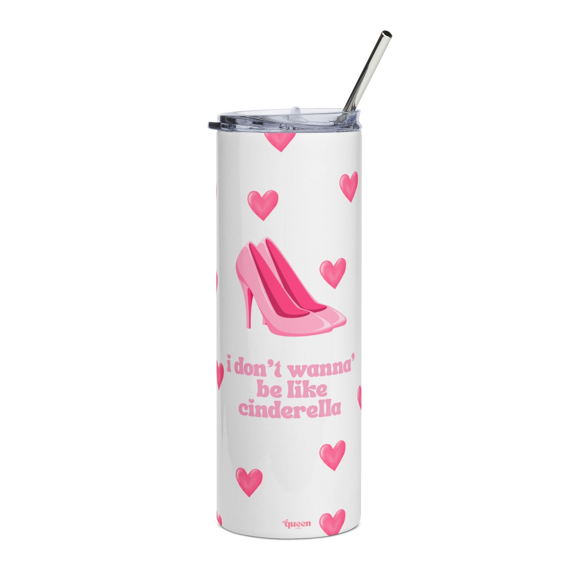 Slim stainless steel tumbler wrapped in a playful, romantic design. Sweet pink heels and scattered hearts float across a clean white background while the cheeky phrase “i don’t wanna be like cinderella” adds a rebellious, flirty note. Lightweight and narrow, this 20 oz vessel slips into cup holders and bags easily. The included lid and metal straw make sipping simple on the go; the glossy protective varnish keeps colors bright and resists everyday wear. Use it for iced coffee, cold tea, or any chilled drink you bring to studio sessions, coffee dates, or long commutes — a little reminder to choose your own story every time you take a sip.