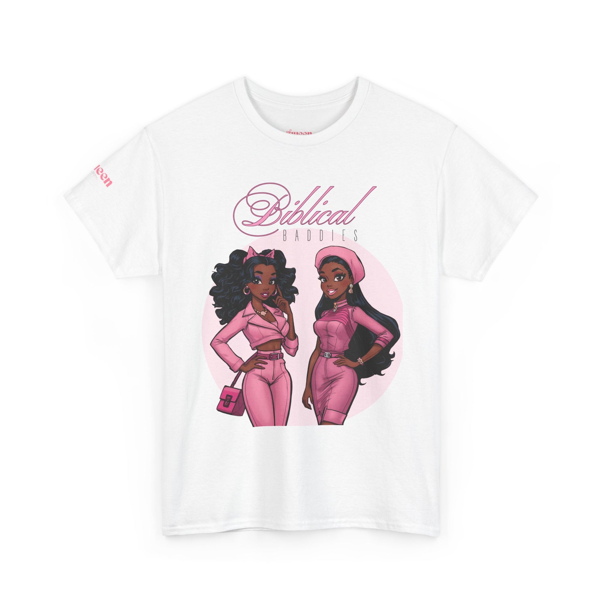 Soft, everyday cotton with a bold, feminine graphic — this classic crew tee blends comfort with personality. The illustration shows two confident, stylish women in pink tones, framed by a soft circular backdrop and elegant script above. Wear it to add a playful, empowered vibe to casual looks: jeans, high-waist shorts, or layered under a jacket. The relaxed fit and midweight fabric give it structure without feeling stiff. Subtle sleeve branding and a clean back keep the focus on the front artwork. Made and finished with durable printing so the colors stay bright through regular wear and washes.