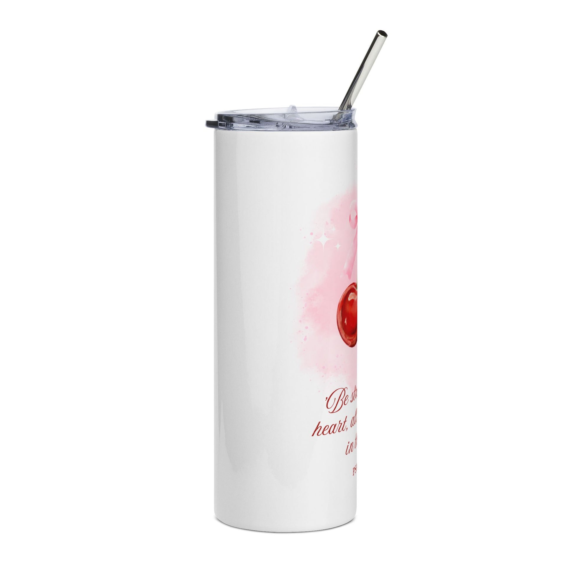 A slim 20 oz stainless steel tumbler wrapped in a soft pink cherry pattern and a heartfelt scripture. The glossy varnish over the high-grade steel gives a smooth, vibrant finish that resists wear while keeping beverages insulated on the go. Comes with a clear lid and matching straw for easy sipping; its tall, cylindrical shape fits most cup holders and offers a full 360° printable canvas so the design reads from every angle. Lightweight and durable, it feels at home on morning commutes, quiet devotional moments, or tucked into a tote for errands and meetups.