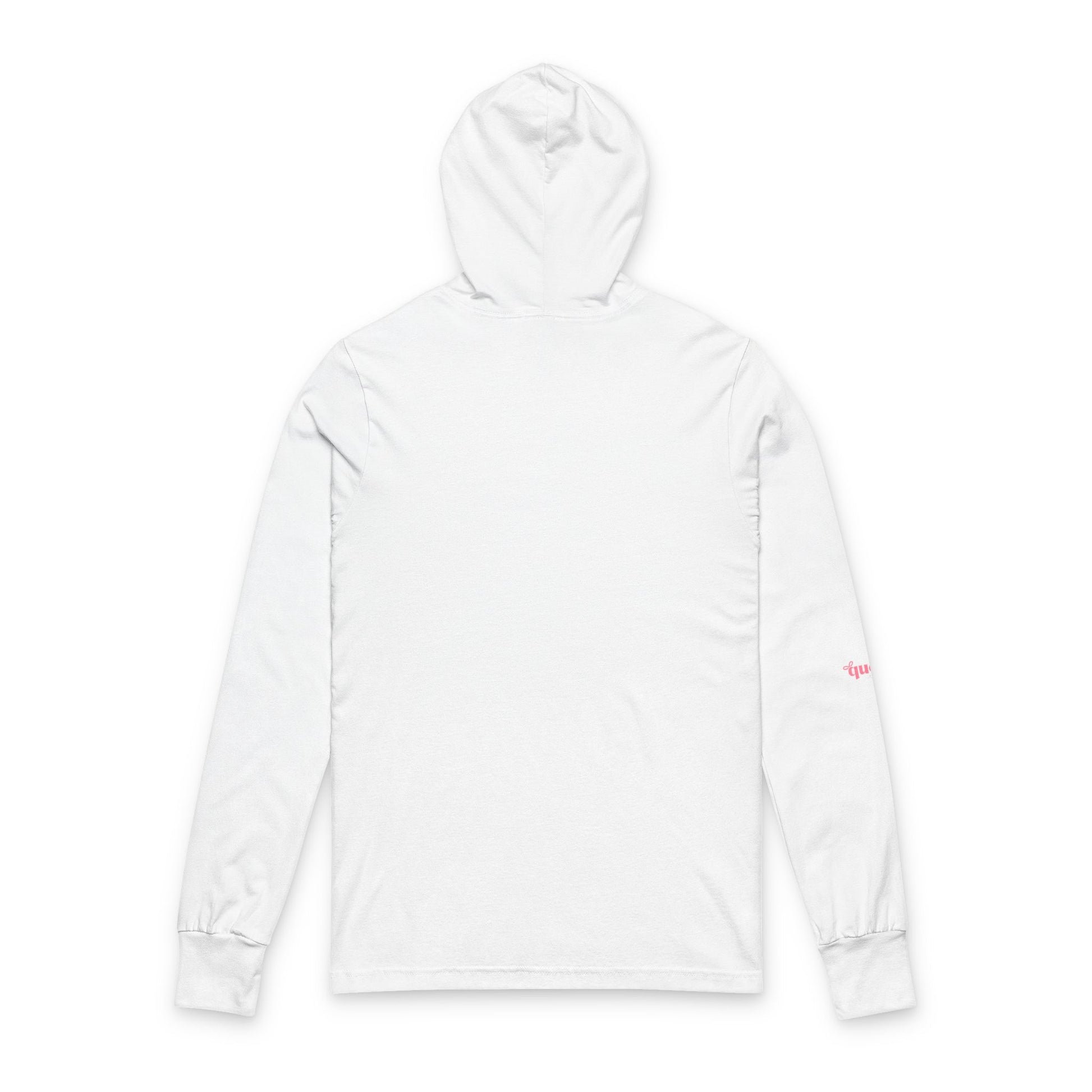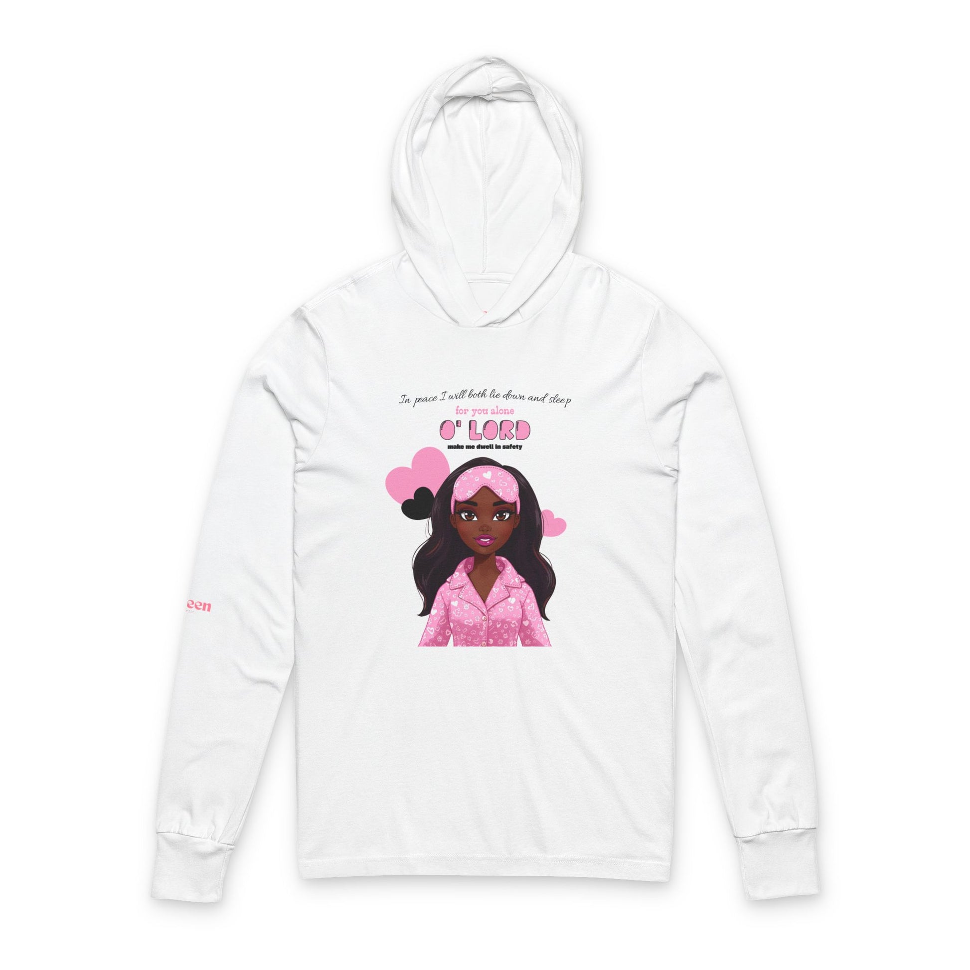 Lightweight hooded long-sleeve that feels like a cool breeze on bright mornings. Soft airlume combed cotton gives a smooth, gentle touch against skin while the side-seamed shape keeps the silhouette neat wash after wash. The front features a warm, illustrated portrait in soft pinks—playful, confident, quietly joyful—bringing a personal, uplifting note to everyday outfits. Wear it as a layered piece on chapel mornings, neighborhood strolls, or informal meetups with friends. The crossover V at the neckline and fitted cuffs give subtle structure without stiffness, so it moves with you whether you’re running errands or lingering over coffee and conversation.