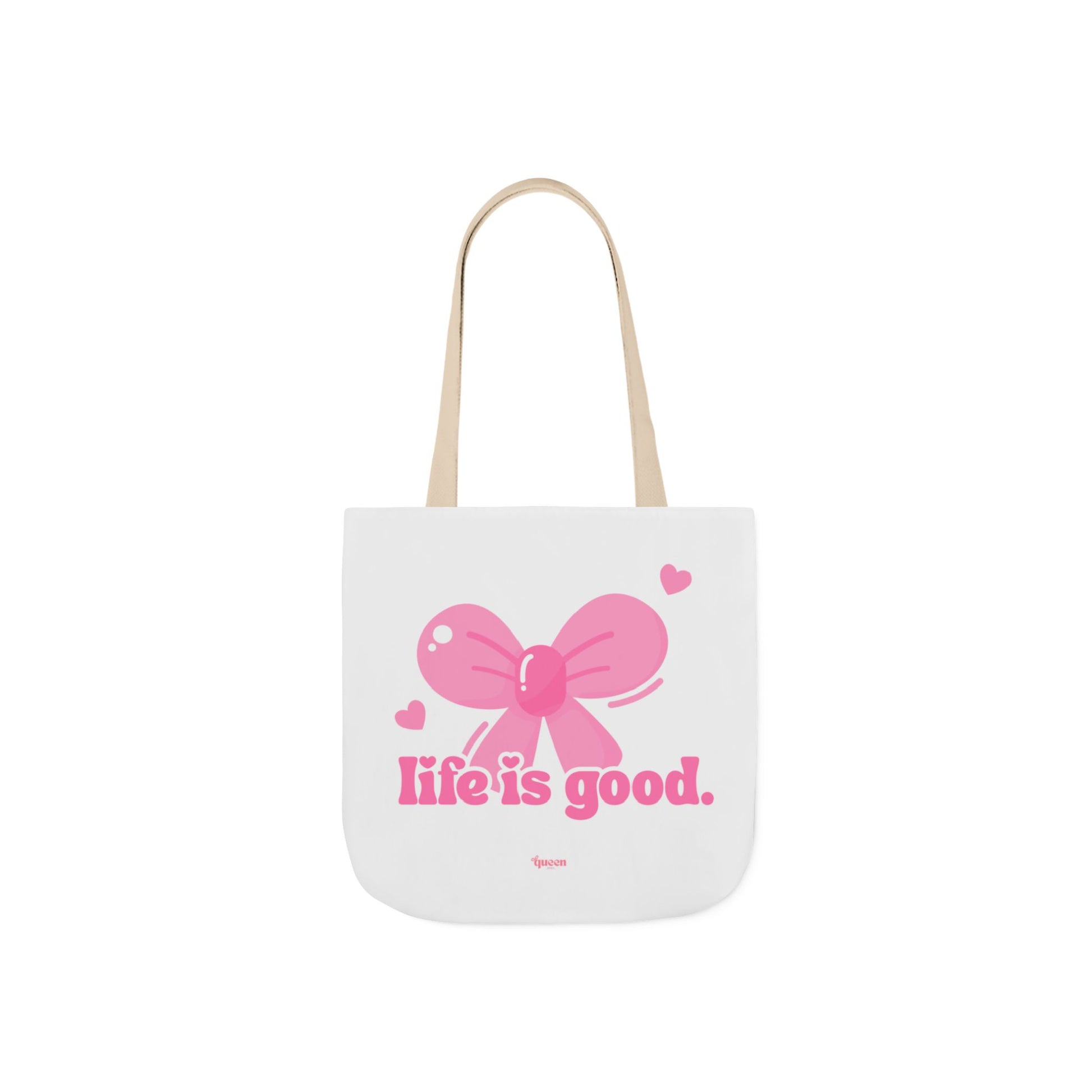 Light, cheerful, and quietly nostalgic — this canvas tote carries a soft-pink bow and the hopeful line “Life is good.” across its face. The fine-weave polyester canvas feels smooth to the touch and the boxed corners give the bag a roomy, structured silhouette that holds everyday essentials without sagging. Choose from five strap colors to match your mood; the black interior keeps contents discreet while the all-over print keeps the artwork crisp and lively. Wear it to farmers’ markets, coffee shops, or a slow weekend stroll and let the small, optimistic design do the smiling for you.